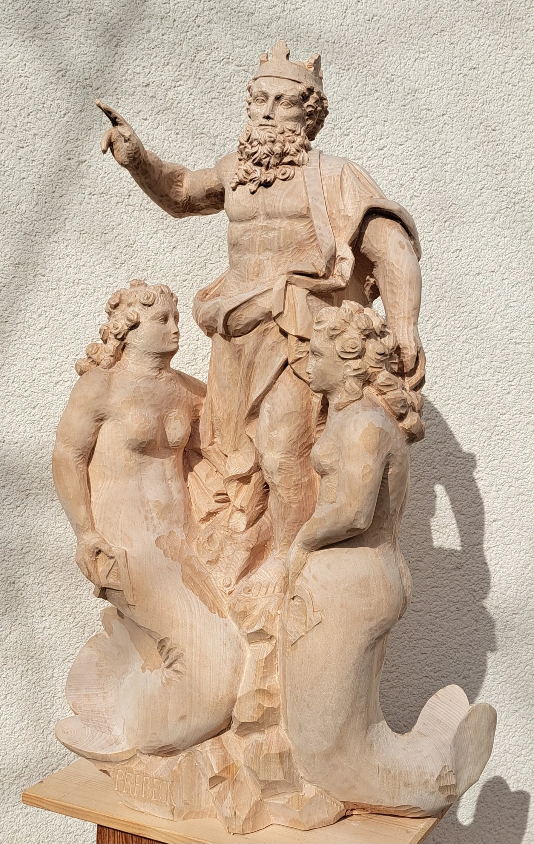 An dieser Figurengruppe schnitze ich in meiner Freizeit. Es handelt sich um die Allegorie des Chiemsees und der Flüsse Tiroler Ache sowie Alz.
